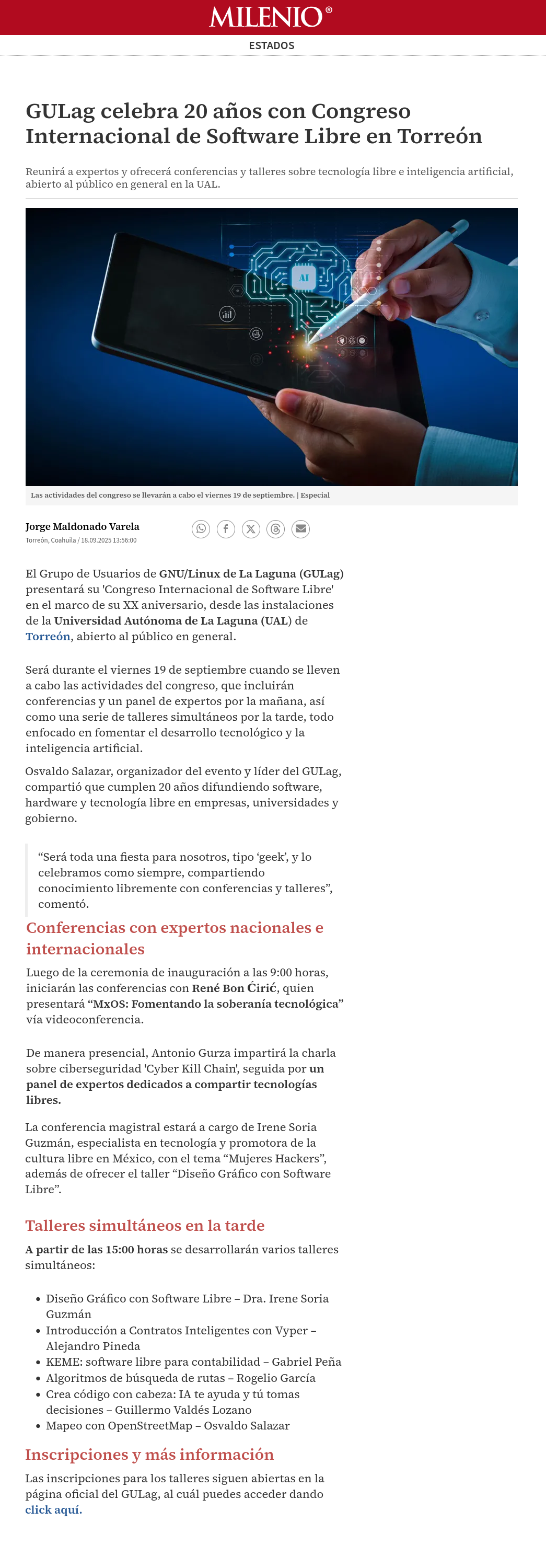 Periódico Milenio : GULag celebra 20 años con Congreso de Software Libre en Torreón