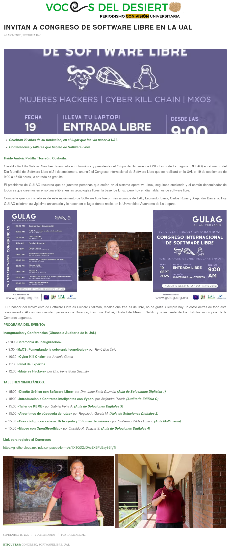 Con motivo del XX aniversario del Grupo de Usuarios de GNU/Linux de La Laguna (GULAG) y en marco del International Software Freedom Day se celebró el Congreso de Software Libre el día 19 de septiembre del 2025 en la Universidad Autónoma de la Laguna.