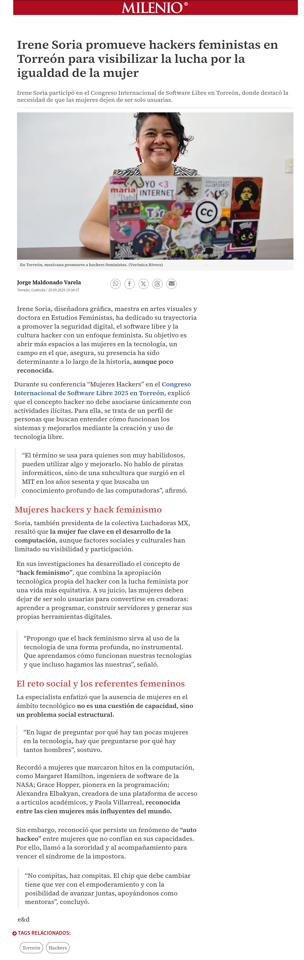 Periódico Milenio : Irene Soria promueve hackers feministas en Torreón para visibilizar la lucha por la igualdad de la mujer